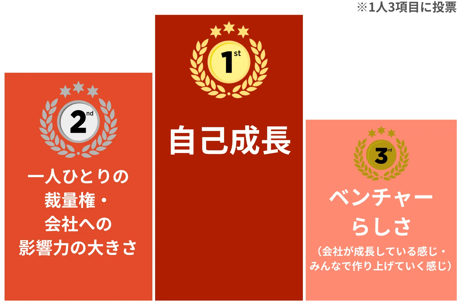 第1位はやはり自己成長!皆さん成長意欲が非常に高く、「厳しい環境で切磋琢磨しながら20代のうちにしっかり成長したい」という声がありました。