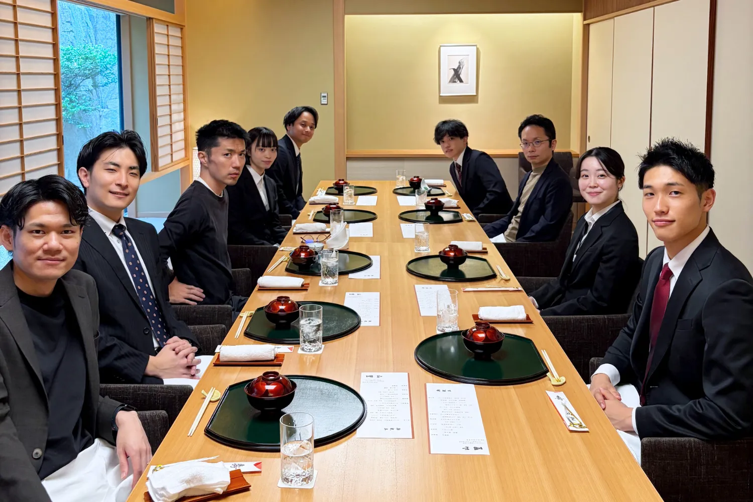 経営陣も既に業務を通して内定者たちを理解しているため、「ここをもっと頑張ろう!」と各メンバーを鼓舞。冗談も交えつつ楽しく和やかな雰囲気の中、美味しい会席料理をいただきました。