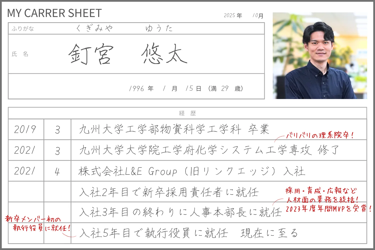 そんな疑問にお答えする、L&E Group(旧リンクエッジ)の経営に携わる役員陣の人柄・キャリアをインタビュー形式で紹介する『MY CAREER SHEET』シリーズ。