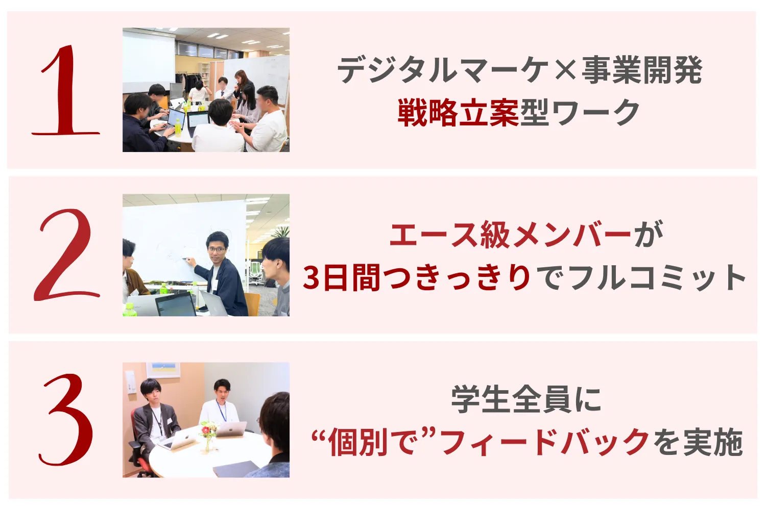 チームに3日間つきっきりで、学生主体でありつつメンターも一緒に議論に入り込むため、視座の高いアウトプットを作り上げることが可能。
