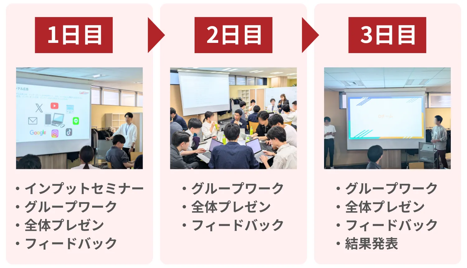 もちろんその後に最後の個別フィードバックも行い、3日間での成長度合いをメンターと一緒に確認できますよ。3日間頭をフル回転させるため、終わった時の達成感は一入です…!