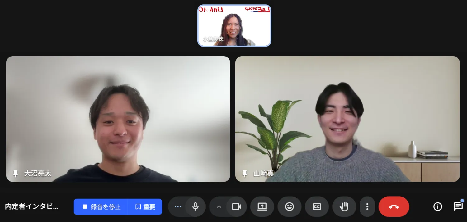 右)山﨑 真:九州大学大学院工学府に所属する修士2年。学部時代は剣道部で副主将を務める他、学生剣道連盟に所属して大会運営なども行う。2024年夏にL&E Group(当時リンクエッジ)のサマーインターンに参加し、リーダーとしてチーム優勝に導く。2025年10月より内定者インターン生として入社。圧倒的な頭脳と溢れ出るユーモアで、リモート勤務にも関わらず既に社内メンバーから注目されています!